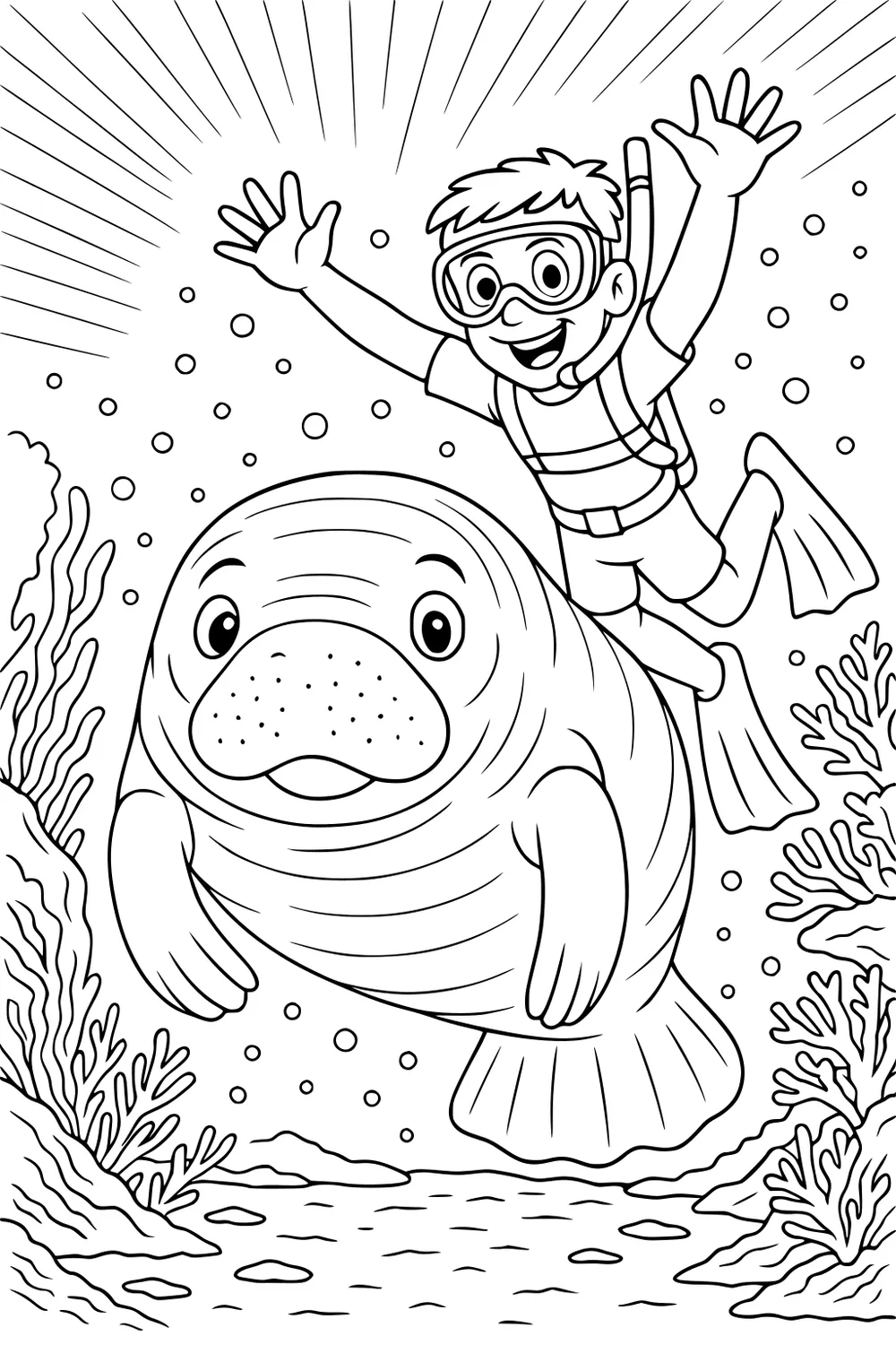 Coloring page of a smiling boy in snorkel gear riding above a large manatee underwater, surrounded by corals, rocks, and bubbles.