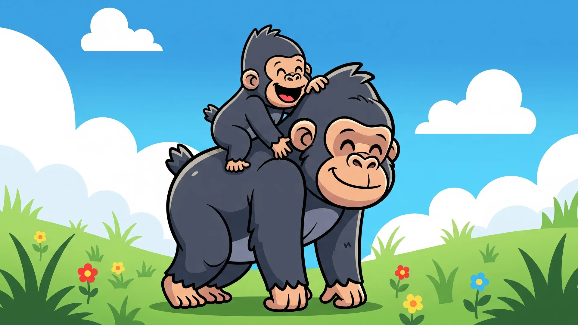 Mama Gorilla walks across the grassy field with her happy baby clinging to her back. The mother’s round face glows with a gentle smile, and her fur looks soft and fluffy. The baby gorilla holds tight, legs dangling, with wide eyes and a big, bright grin that shows he is having the best day.