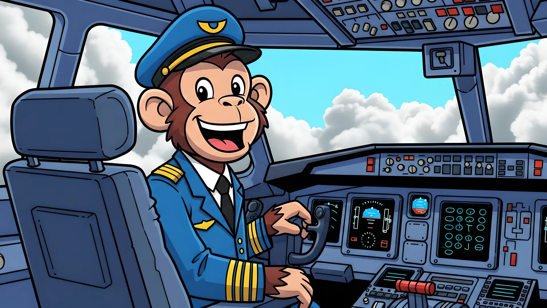 The cockpit around them bristles with buttons, switches, and levers, all waiting for their skilled hands. Snug chairs keep the monkeys steady as they study the control panel, their eyes bright with excitement. Sunlight pours through the windows, making the space feel busy and important, just right for a team of flying friends.